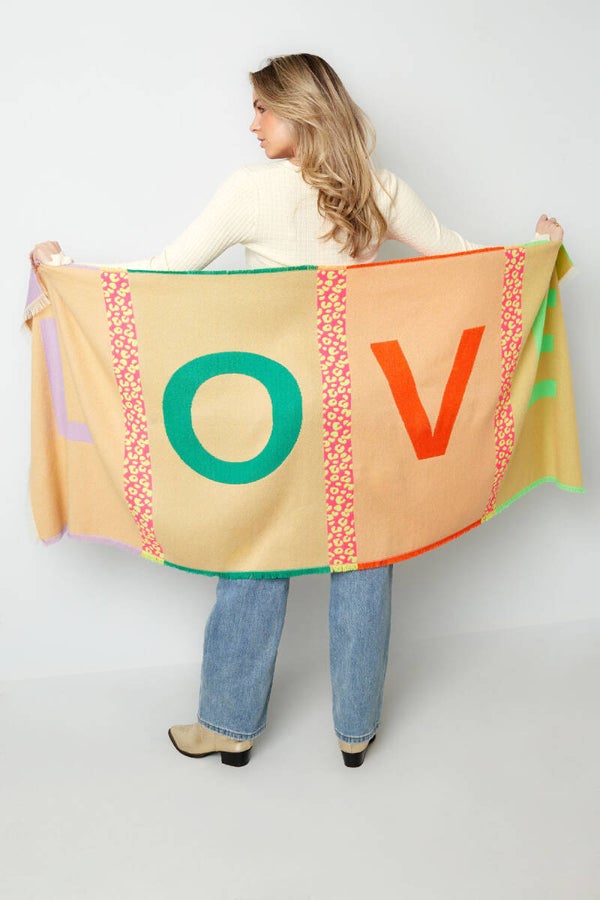 Voeg een trendy twist toe aan je look met onze veelzijdige sjaal! Gemaakt van 100% acryl en verkrijgbaar in verschillende kleuren, is deze sjaal een must-have accessoire. Met afmetingen van 60 bij 190 centimeter biedt het voldoende warmte en stijl. De hoofdkleur is beige, met opvallende grote letters die samen het woord 'LOVE' vormen. Iedere letter wordt gescheiden door een streep van roze panterprint, wat zorgt voor een speels en modieus accent. Voeg wat warmte en liefde toe aan je outfit met deze sjaal