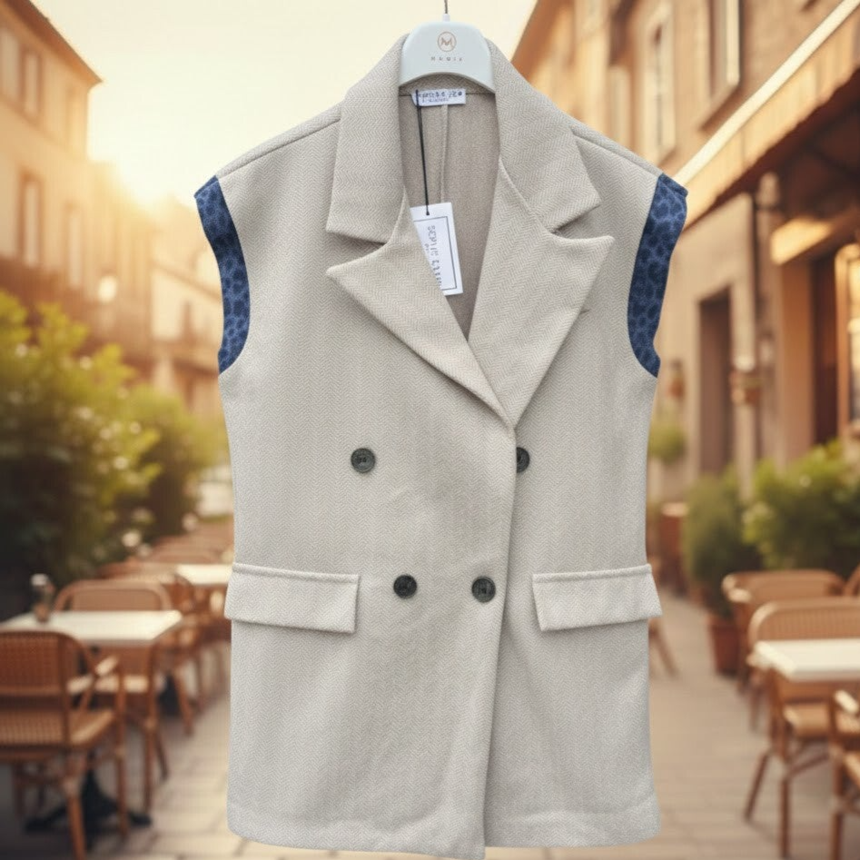 Laat je Stralen met het Trendy Gilet met Strass en Lichtblauwe Panterprint Schouderdetails van Sophie&Me Amsterdam.